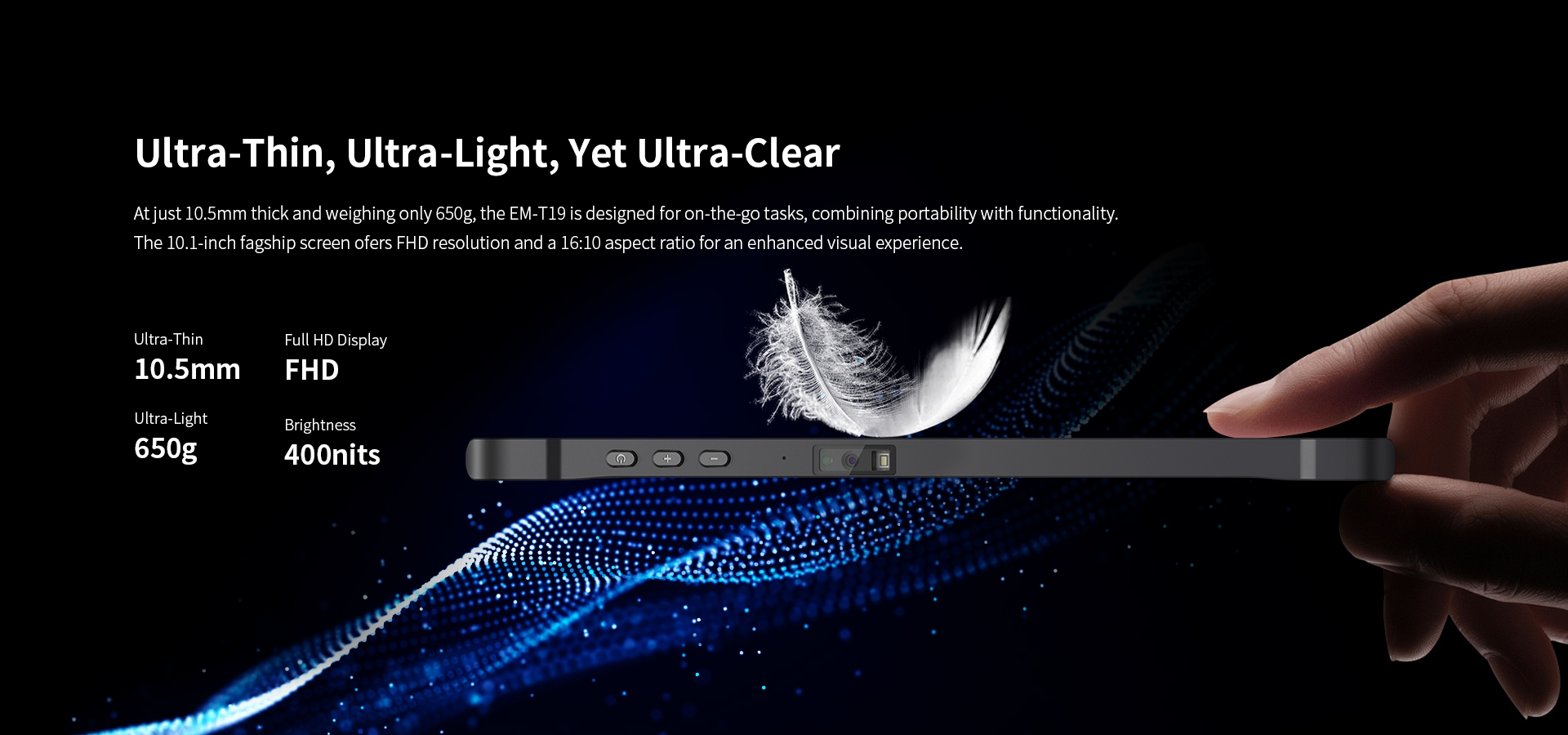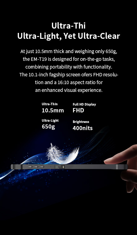 At just 10.5mm thick and weighing only 650g, the EM-T19.The 10,1-inch fagship screen ofers FHD resolution At just 10.5mm thick and weighing only 650g, the EM-T19.The 10,1-inch fagship screen ofers FHD resolution