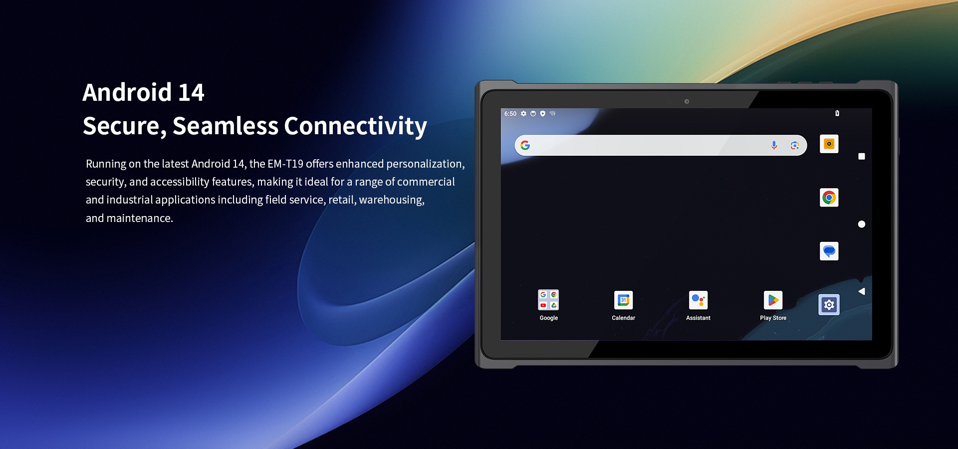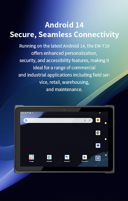 Running on the latest Android 14, the EM-T19 offers enhanced personalization,security, and accessibility features. Running on the latest Android 14, the EM-T19 offers enhanced personalization,security, and accessibility features.