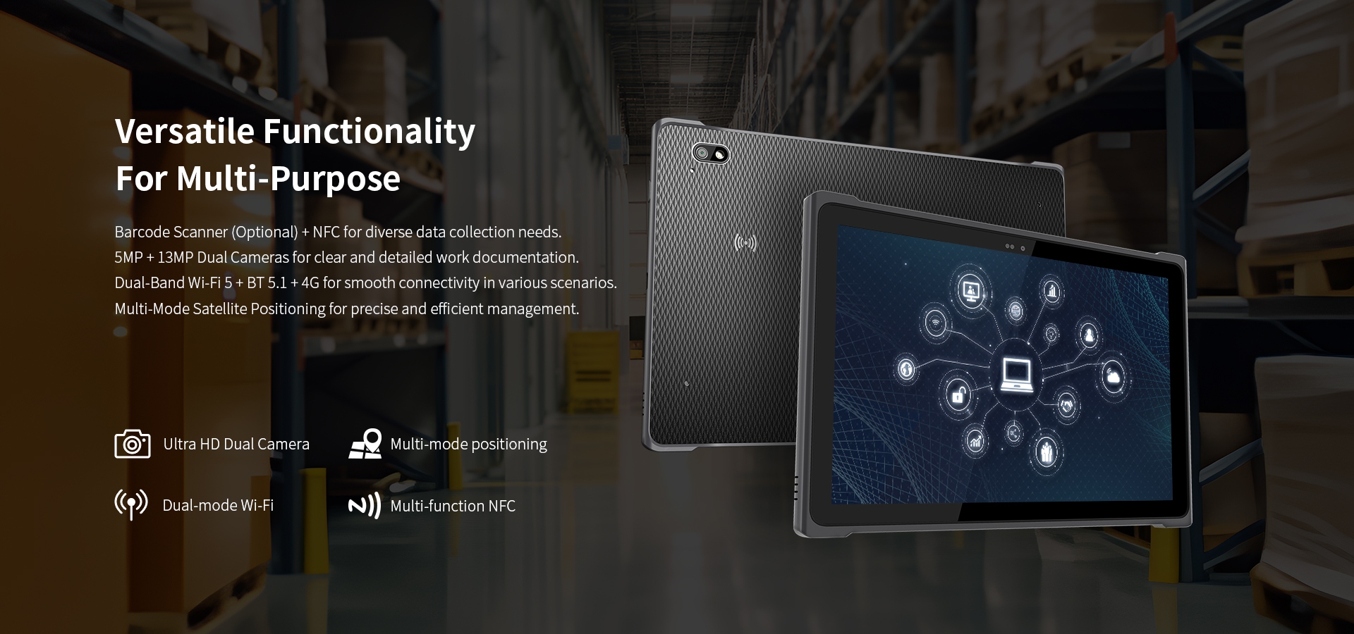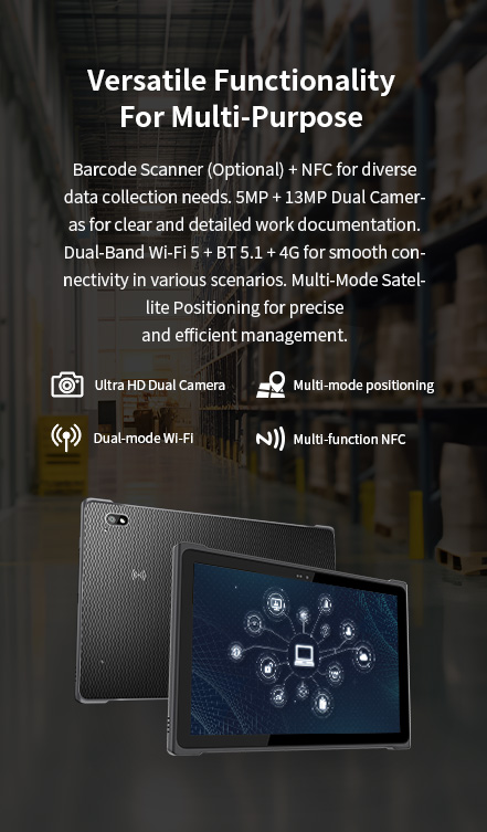 Versatile Functionality,Barcode Scanner (Optional) + NFC.,5MP+ 13MP Dual Cameras.,Dual-Band Wi-Fi 5 + BT 5.1 + 4G,Multi-Mode Satellite Positioning. Versatile Functionality,Barcode Scanner (Optional) + NFC.,5MP+ 13MP Dual Cameras.,Dual-Band Wi-Fi 5 + BT 5.1 + 4G,Multi-Mode Satellite Positioning.