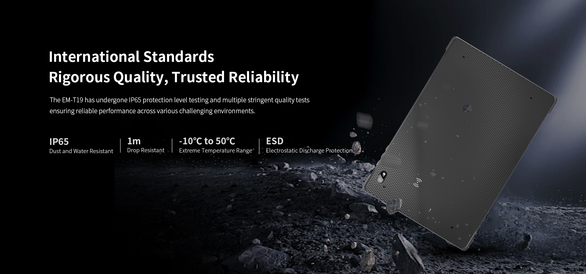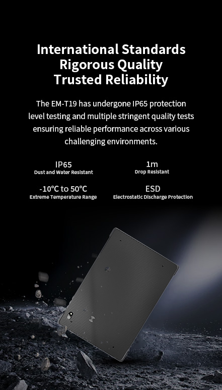 InternationalStandardsRigorous Quality, Trusted Reliability-The EM-T19 has undergone lP65 protection level testing. InternationalStandardsRigorous Quality, Trusted Reliability-The EM-T19 has undergone lP65 protection level testing.