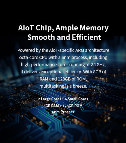 Powered by the AloT-specifc ARM architecture octa-core cPU with a 6nm process,including cores running at 2.2GHz. With 8GB of RAM and 128GB of ROM. Powered by the AloT-specifc ARM architecture octa-core cPU with a 6nm process,including cores running at 2.2GHz. With 8GB of RAM and 128GB of ROM.