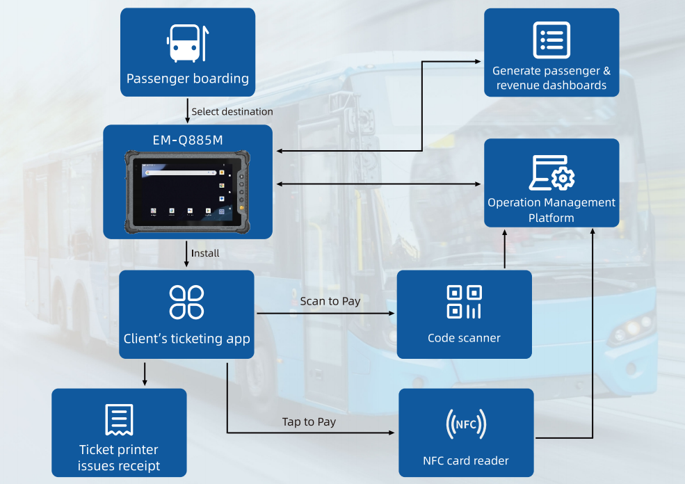 Emdoor Information developed a fully integrated solution based on the EM-Q885M rugged tablet,addressing the core issues of device integration,environmental adaptability,and system stability in bus ticketing.
